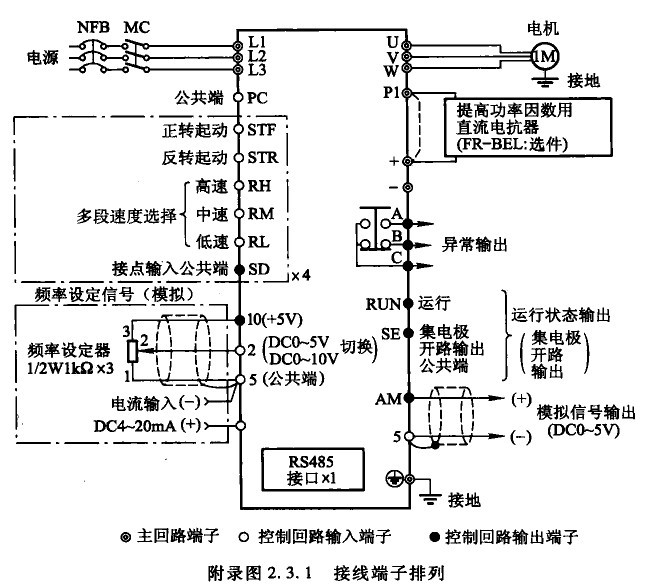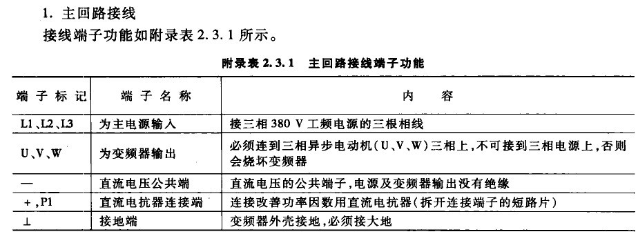 控制回路接线必须与主回路分开,否则会引起干扰,使控制功能失灵,根据使用要求,设计控制回路接线.不需要的端子可以空开不用,控制端子功能如附录表2.3.2.