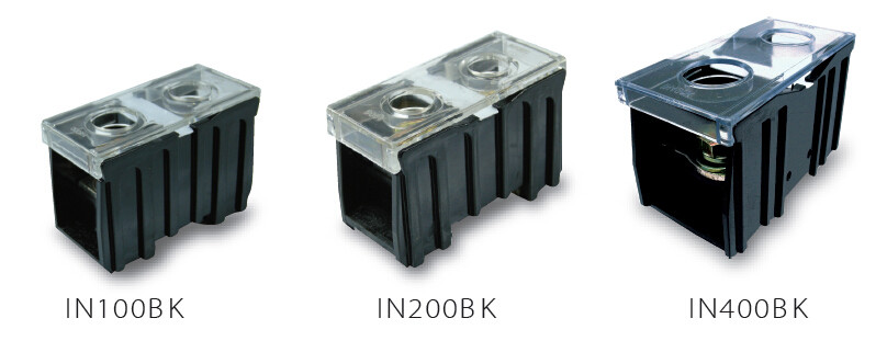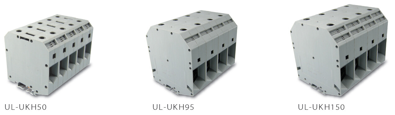 在于每个连接区由绝缘座、U型架、螺母、内六角螺丝及上、下活块构成,上、下活块相对接触面之间设有接线孔,内六角螺丝通过螺母顶在上活块上,其目的是为了将不同粗细的电缆线直接连接在大电流接线端子上。与现有技术相比,它可灵活组合拼接端子单元数,可压接单股或多股电缆线,且连接牢固可靠,安装与维修简易方便等优点。