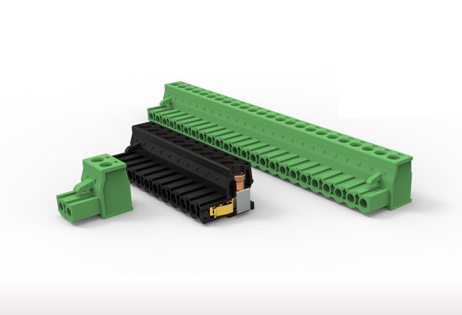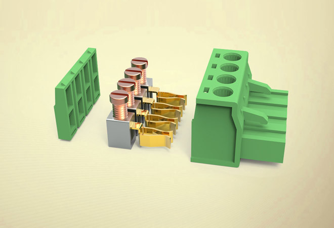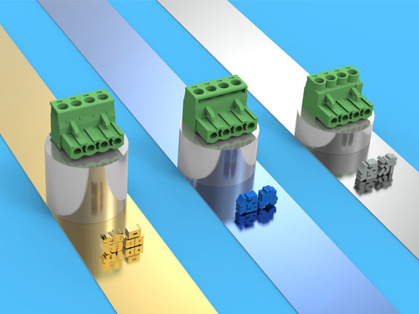 YL1-5.08插拔式接线端子导电件采用镀金工艺(镀层8-15μm),其优势在于可以有效减少金属接触面的微动腐蚀, 进而减少接触电阻,增加电流导通性;端子不镀银的原因:银较金易氧化,接触电阻同比增加进而影响接触表面信号的传输效果。