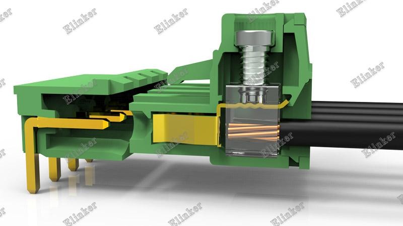 上图为联捷LC1系列插拔式接线端子的剖视图和结构图。从图中我们可以清晰的看出导线从插孔进入压线框,再给螺丝施加扭力,在螺丝的压力之下,导线稳稳的固定在压线框内,从而保证了与导电件的永久连接。