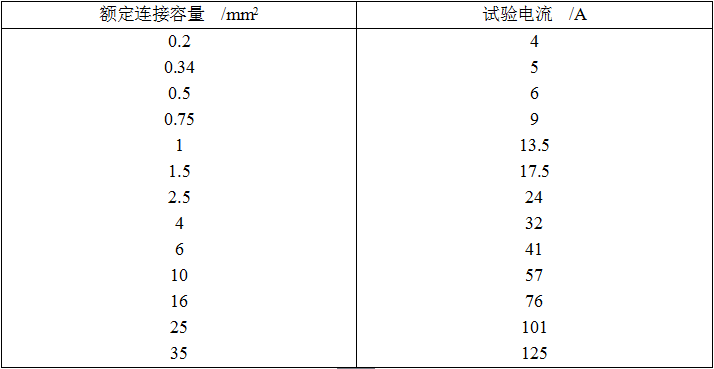 温升的试验应在受试连接器件已达到热平衡状态的情况下进行。通常,当受试部件的温度在1h内增加不超过1K时,则认为温度达到稳定。在整个试验期间,应给连接器件施加下表所示的交流负载。