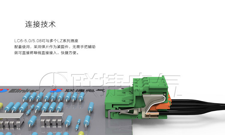 LC6-5.08与LZ1R-5.08/LZ1V-5.08,插头为采用弹簧接线技术的插头。这类2-16位的插头可以取代相应的螺钉接线LC5系列相同针距插头,与所有针距为5.08mm的插座配合使用。利用LC6-5.08与LZ1R-5.08/LZ1V-5.08可很容易的构成两导线束的连接。