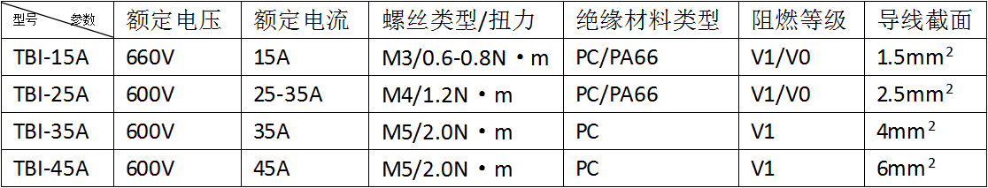 TB1系列接线端子属于无轨式端子排,安全、环保、防滑丝,并顺利通过CE、CQC和Rosh认证。本产品由联捷电气自主创新设计,在老式TB接线端子的基础上增加了透明盖镂空设计、盖子防错插、印标志系统,并通过改善绝缘件的尺寸增大了爬电距离,让产品质量更有保证。有15A/25A/35A/45A四种规格,相关数据如下: