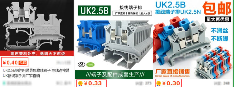 该接线端子排的材料构成有尼龙材料的绝缘件,铜合金电镀雾锡或电镀镍的压线框、导电件,铜螺丝。从绝缘件的尼龙材料来看,货真价实的材料40000元/吨,也就是0.04元/克,一片UK1.5N接线端子绝缘件的质量为5克/片,这样算来单绝缘件的材料成本就要0.2元,再加上铜材的成本,电镀的成本,生产组装的成本,远高于淘宝上某些商家的标价0.4/0.33/0.3元/片。(图为淘宝随机截选图片,如涉侵权请联系撤销。)