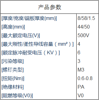 端子由边插式桥接件、连接销、快速标记条、导电件、螺丝等部件组成。产品参数如下: