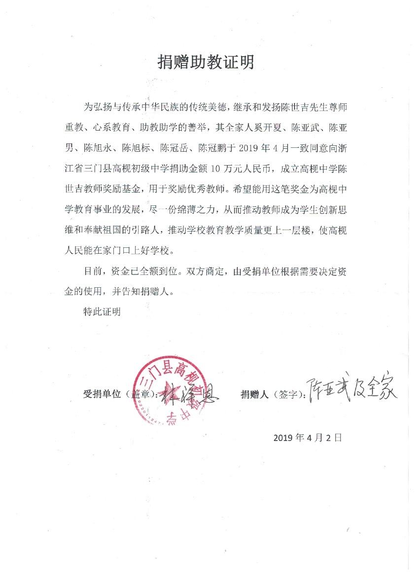 为弘扬与传承中华民族的传统美德,继承和发扬陈世吉先生尊师重教、心系教育、助教助学的善举,联捷电气创始人奚开夏、陈亚武、陈亚男、陈旭永、陈旭标、陈冠岳、陈冠鹏于2019年4月一致同意向浙江三门县高视中学捐助金额10万元人民币,成立高视中学陈世吉教师奖励基金,用于奖励较好教师。希望能用这笔奖金为高视教育事业的发展尽一份绵薄之力,从而推动学校教育质量更上一层楼,使高视学生能在家门口读上好学校。