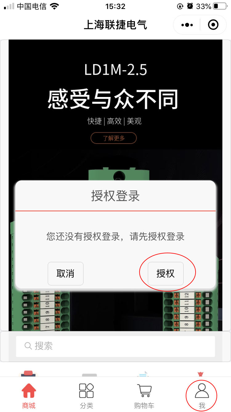 2.点击进入小程序并授权登录:我—授权—允许