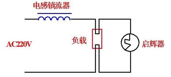 如下图,施加220V交流电源时,电流流过镇流器,灯管灯丝启辉器给灯丝加热(启辉器开始时是断开的,由于施压了一个大于190V以上的交流电压,使得启辉器内的跳泡内的气体弧光放电,使得双金属片加热变形,两个电极靠在一起,形成通路给灯丝加热),当启动器的两个电极靠在一起,由于没有弧光放电,双金属片冷却,两极分开,由于电感镇流器呈感性,当电路突然中断时,在灯两端会产生持续时间约1ms的600V—1500V的脉冲电压,点亮灯管,其确切的电压值取决于灯的类型。