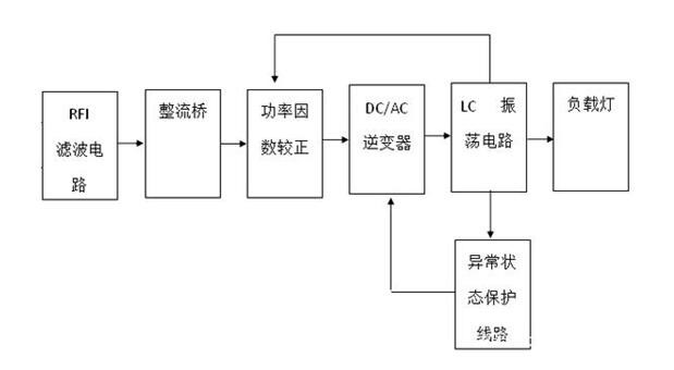 如下图,市电经过射频干扰(RFI)滤波器,全波整流和功率因数校正器(PPFC或APFC)后,变为直流电源。通过DC/AC变换器,输出20K—100KHZ的高频交流电源,加到与灯连接的LC串联谐振电路加热灯丝,同时在电容器上产生谐振高压,加在灯管两端,促使灯管“放电”变成“导通”状态,再进入发光状态,此时高频电感起限制电流增大的作用,保证灯管获得正常工作所需的灯电压和灯电流,为了提高可靠性,常增设各种保护电路、如异常保护、浪涌电压、电流保护、温度保护等等。
